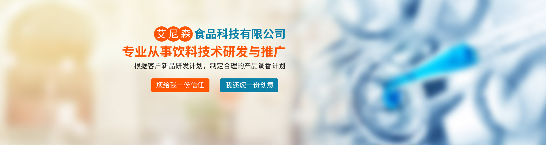 廊坊市艾尼森食品科技公司是一家專業(yè)從事飲料技術(shù)研發(fā)與推廣的公司,公司業(yè)務(wù)主要包括食品飲料技術(shù)咨詢與服務(wù)、產(chǎn)品定位與現(xiàn)有產(chǎn)品品質(zhì)改進、新產(chǎn)品技術(shù)工藝研發(fā)等。公司坐落于京津冀核心地帶--廊坊市,位置得天獨厚,現(xiàn)與京津多家研究所形成戰(zhàn)略合作關(guān)系,為多家上市公司及知名企業(yè)提供技術(shù)支持與原材料供應。